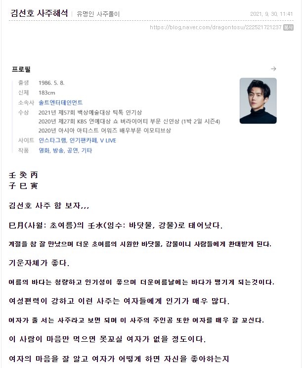 이번엔 김선호의 사주에 대해 알아보겠습니다. 출처는 네이버 블로그 활인당사주명리 상담소입니다.