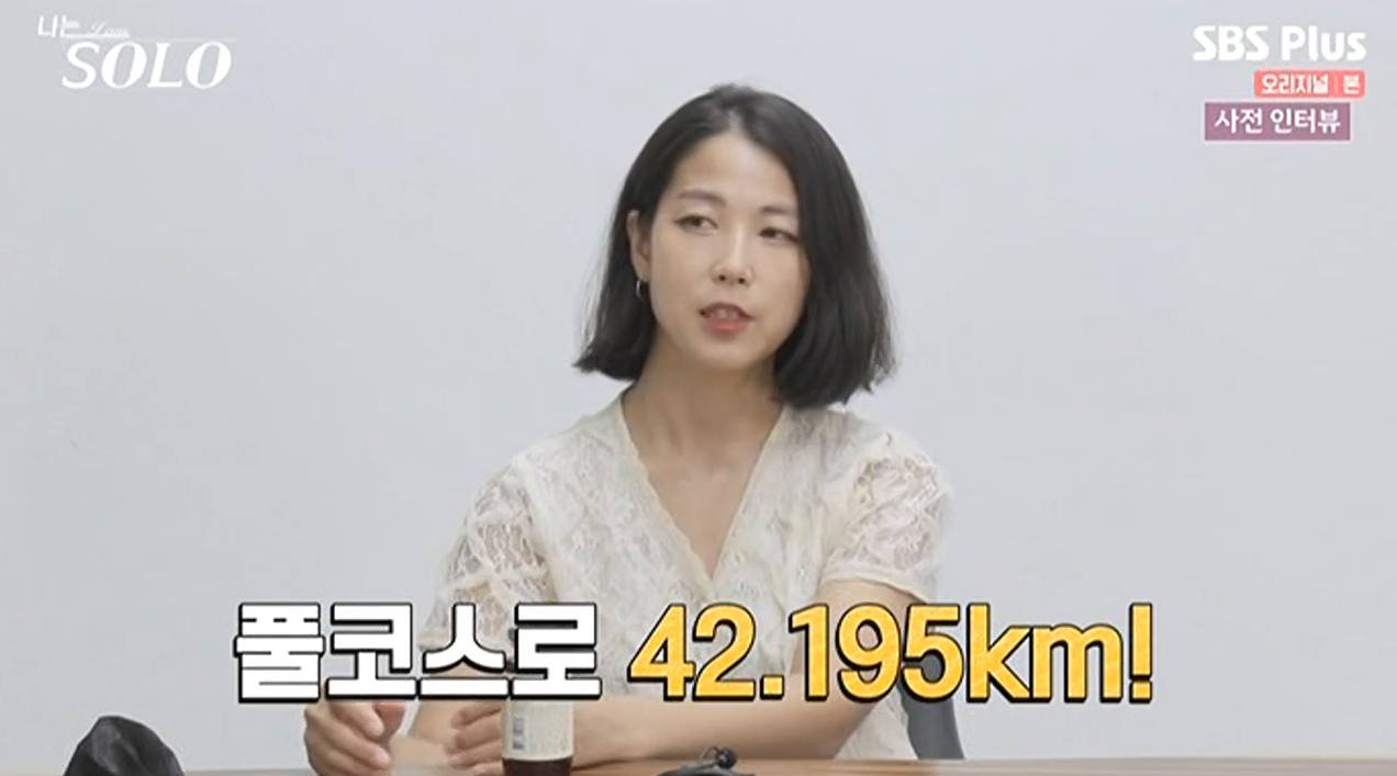 자막에 강철체력이라고 적혀있는 영숙. 실제 러닝크루를 뛰고 있으며, 마라톤 풀코스 42.195km 를 완주하셨다고 하네요.