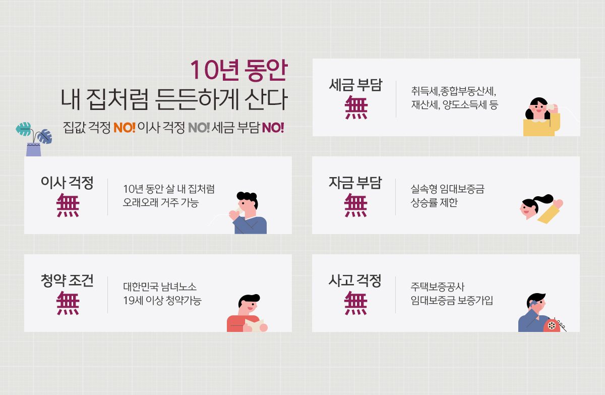 2년마다 이사&재계약에 피곤함을 느끼셨던 분들이라면 최대 10년 동안 거주할 수 있습니다.