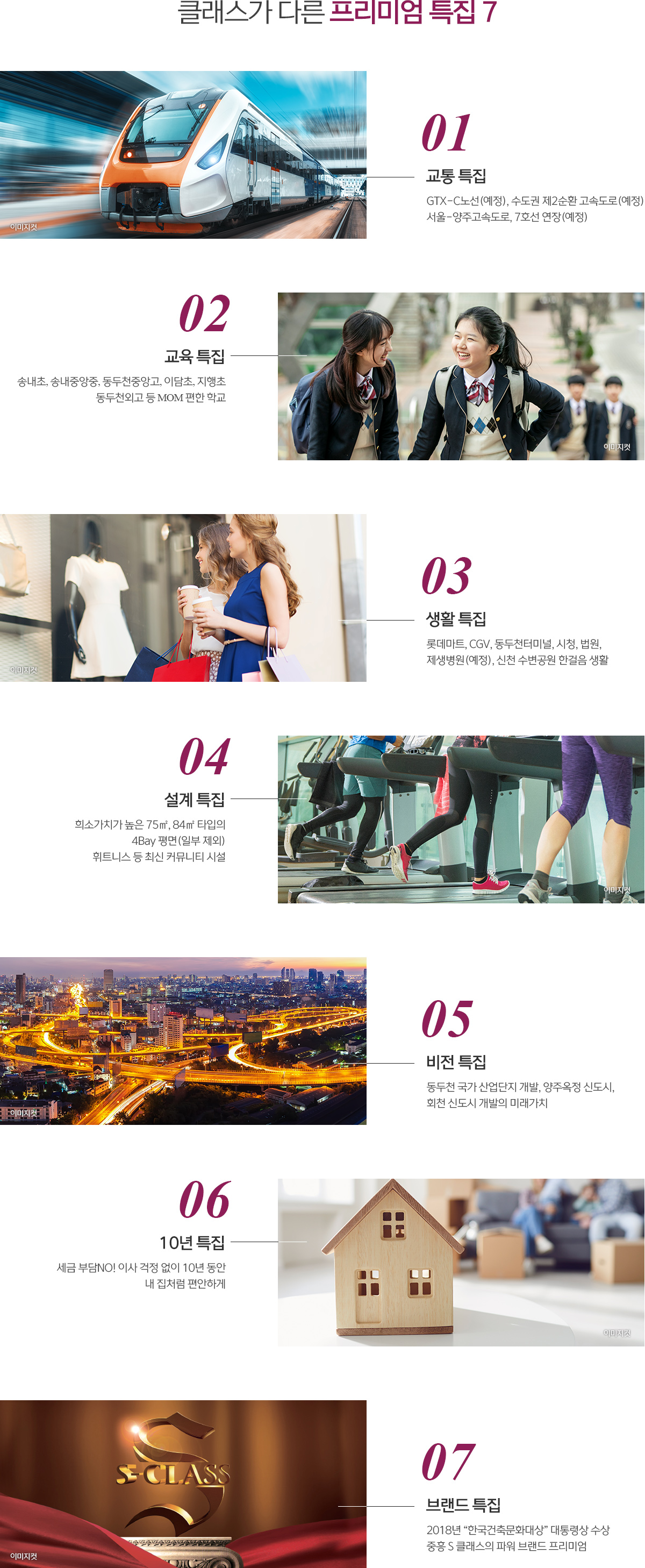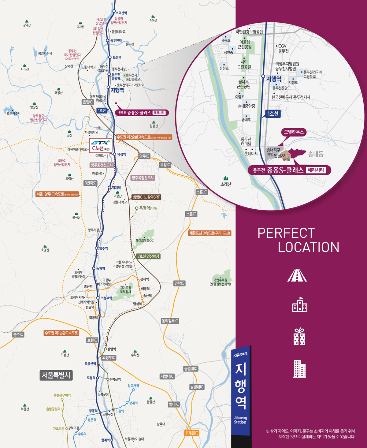 수도권 제2순환 고속도로의 파주~양주 구간(예정), 서울~양주고속도로 등 도로 교통망까지 더해져 수도권 타 지역으로의 자차 이동도 편리할 것으로 보입니다. 이 외에도 인근으로 지하철 7호선 연장 사업(옥정~포천)도 계획돼 있어 주변 교통망은 탄탄해질 전망이나 '동두천중흥S클래스' 주변은 좀 더 개발해야할 여지가 있습니다.