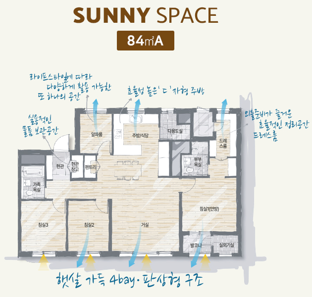 일부 세대에는 4베이, 3면 발코니 구조 등의 설계가 적용되어 채광·통풍을 강화했습니다.