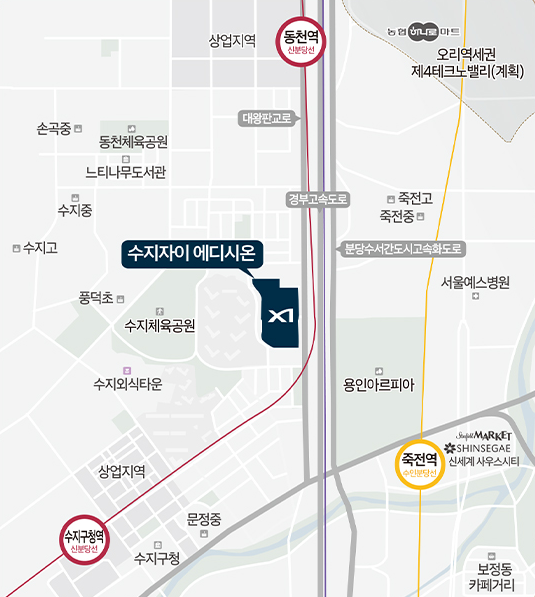 위 단지는 신분당선 동천역 및 수지구청역 도보권에 위치해 있어 판교역까지 3정거장, 강남역까지 7정거장으로 접근성이 우수합니다.