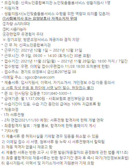 채용공고는 지자체 복지관, 시청홈페이지에 연말~연초에 올라오기때문에 자주 들여다 보시는게 좋습니다.