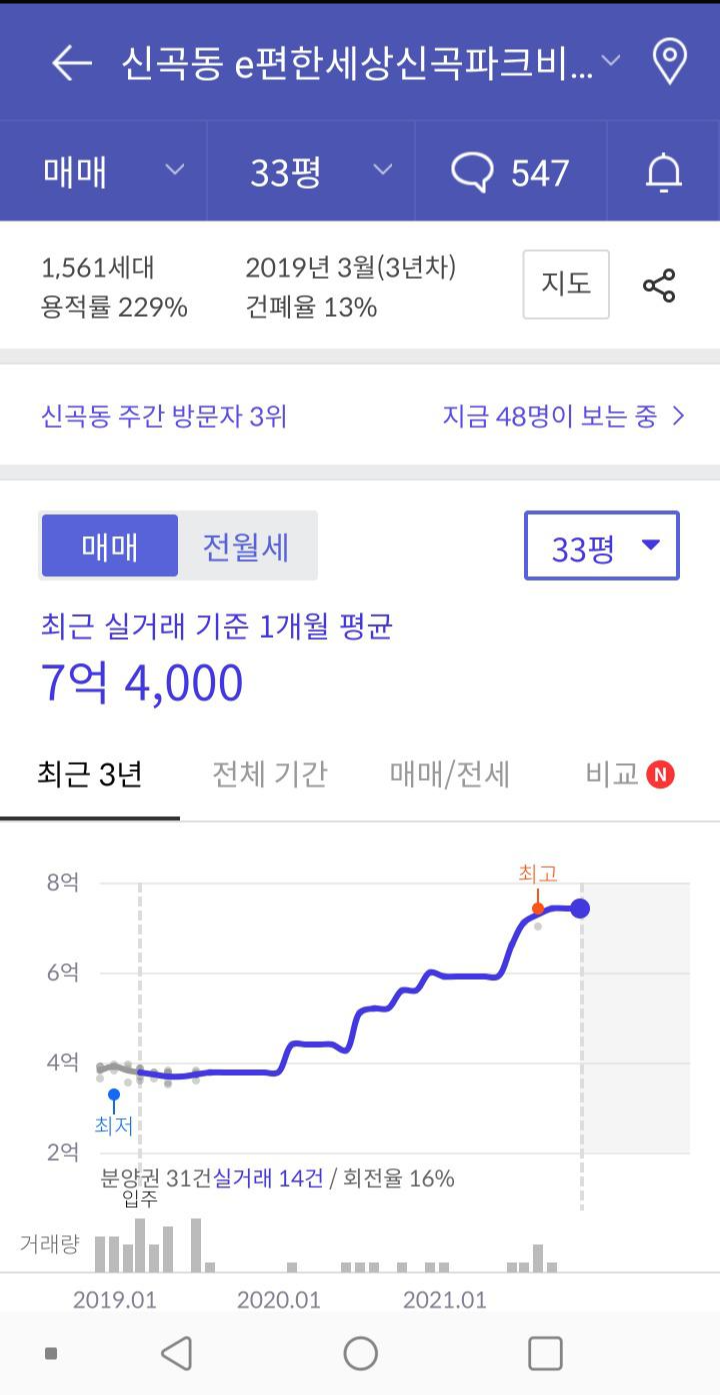 인근에 있는 신축 이편한세상파크비스타의 경우 최근 평균가 7억4천에 거래된 것을 볼 수 있습니다.