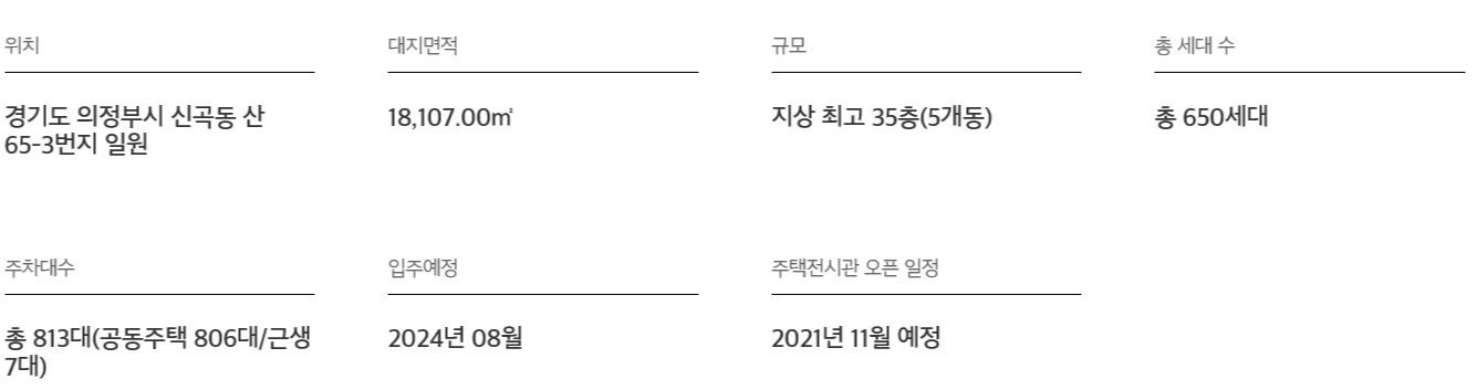 위치는 의정부시 신곡동 산653번지 일원이며, 지상최고 35층(5개동) 총 세대수는 650세대입니다.