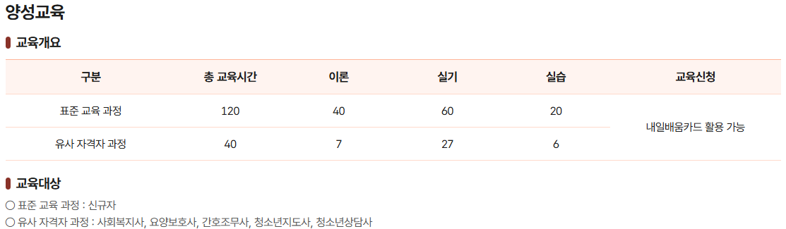 유사 자격증으로(사회복지사, 요양보호사, 간호조무사, 청소년지도사, 청소년상담사)를 인정해주기 때문에 해당 자격증소지자는 교육시간이 40시간으로 축소받으실 수 있습니다.