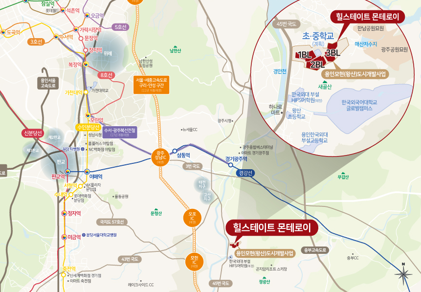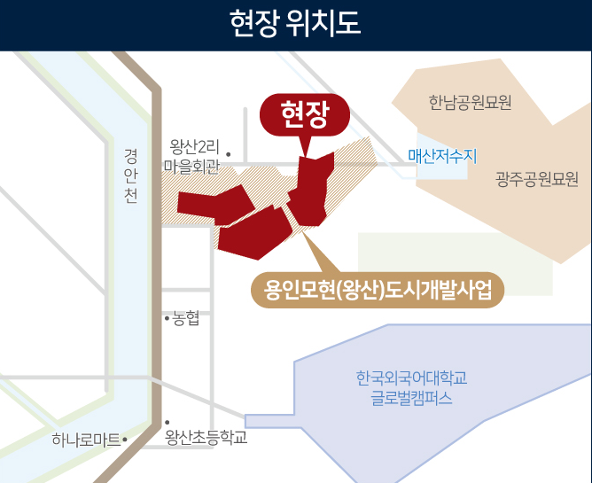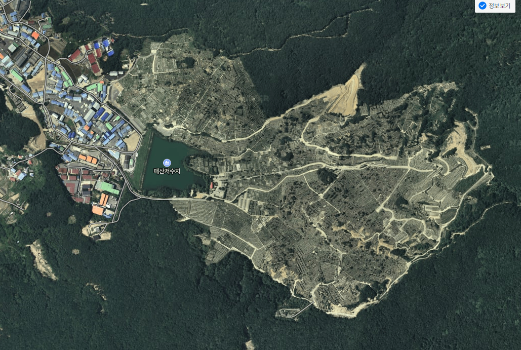 힐스테이트 몬테로이의 현장을 보시면 서쪽으로는 경안천이 흐르고 동쪽으로는 매산저수지와 왕산리와 매산리가 위치하고 있습니다. 배산임수의 명당이지만 아쉬운점은 저수지 뒤로 한남공원묘원+광주공원묘원의 파노라마 묘지뷰가 펼쳐진다는 것인데요.
