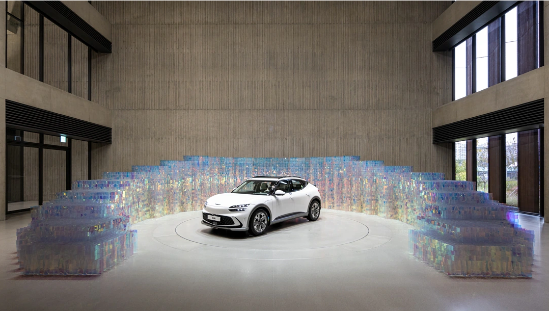 제네시스의 혁신적인 기술과 심미적인 아트가 조화를 이룬 GV60 특별 전시는 수만개의 재활용pet 을 활용한 다이크로익 필름으로 인상적 무지갯빛 공간이 조성되었다고 하는데요.