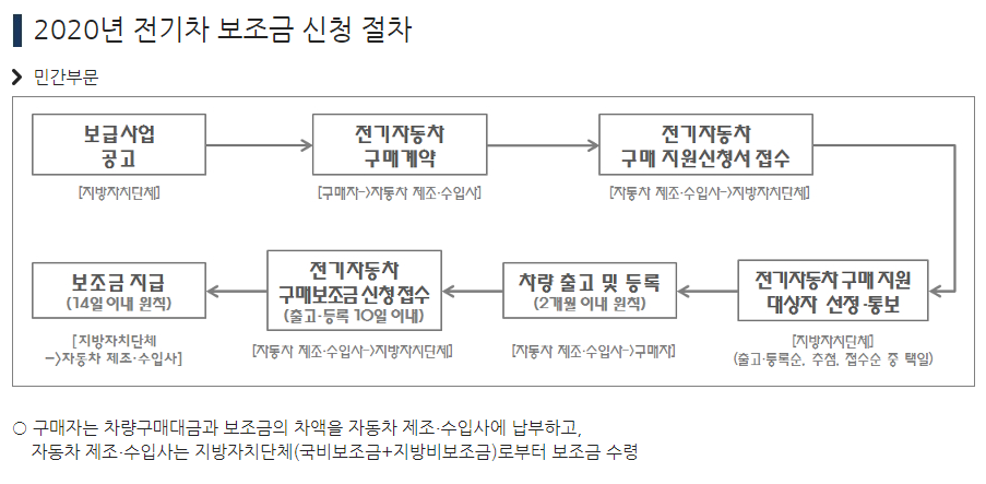 이 때, 자동차업체(제조/수입사)에서 지방자치단체로 신청서를 제출하기 때문에 전기차를 구매하시는 분들은 자동차업체에(제조/수입사) 반드시 방문하여 상담을 받으시길 바랍니다.