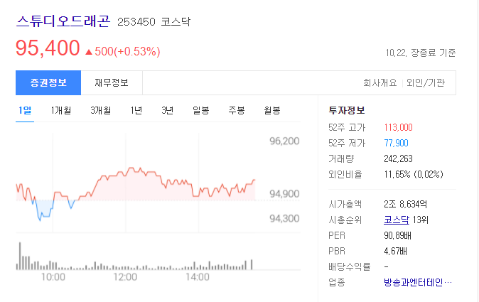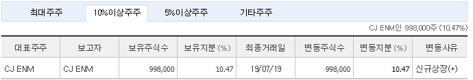 다음은 스튜디오드래곤의 모회사인 CJ ENM 입니다. CJ ENM은 제작사 에이스토리의 지분을 10% 가량 가지고 있는 회사이기도 합니다.