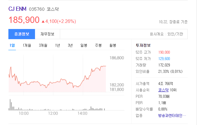 전문가는 CJ ENM의 목표주가를 23만 원→25만 원 상향 조정하기도 했는데요. 그 이유는 온라인동영상서비스(OTT) 자회사인 티빙의 구독자 수가 빠르게 늘고 있는데다, 연예기획사인 SM엔터테인먼트에 대한 인수 협상까지 진행하고 있어 앞으로 기업의 성장성이 기대되기 때문입니다.
