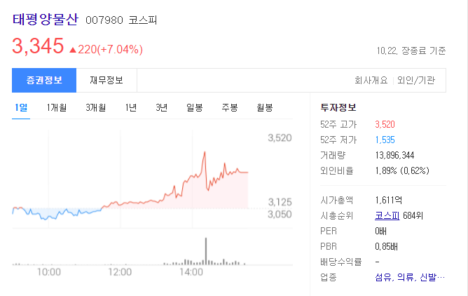 그 때문인지 태평양물산의 주가가 가파르게 상승했습니다.