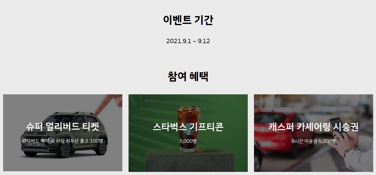 슈퍼얼리버드 티켓(최우선 출고 100명), 스타벅스 기프티콘, 캐스퍼 카셰어링 시승권(8시간 이용권) 등 다양한 이벤트중이니 관심있으신 분들은 참여해보시면 좋을 것 같습니다.
