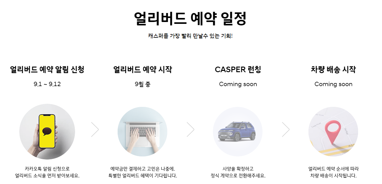 ※ 얼리버드 예약을 놓치실 경우, CASPER 런칭 시점부터 차량 구매가 가능하니 참고하시기 바랍니다.