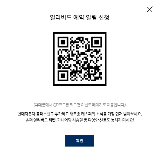 QR코드를 통해 이벤트 페이지로 이동할 수 있으며, 현대자동차 플러스 친구를 추가하고 캐스퍼의 소식을 가장 먼저 받아보실 수 있습니다. 또 얼리버드 예약 개시 일정을 별도로 안내해 준다고 하네요.