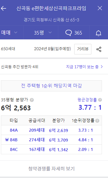 가장 넓은 84㎡ 기준으로 6억원대 초,중반이 예상됩니다.