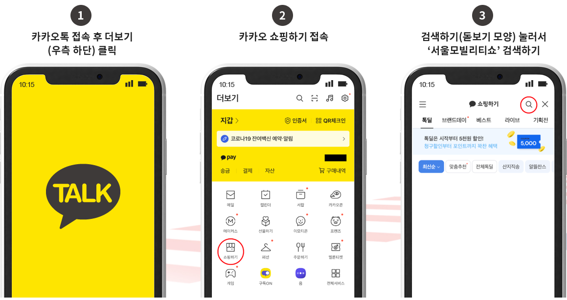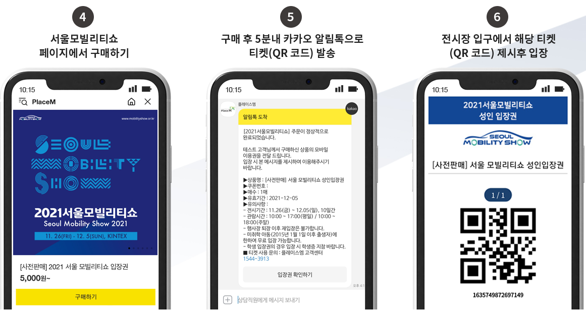 현장예매 뿐 아니라 카카오톡 쇼핑하기에서도 서울 모빌리티쇼 티켓을 구매하실 수 있습니다. 방법을 위 사진속 이미지를 차근히 따라하시기 바랍니다.