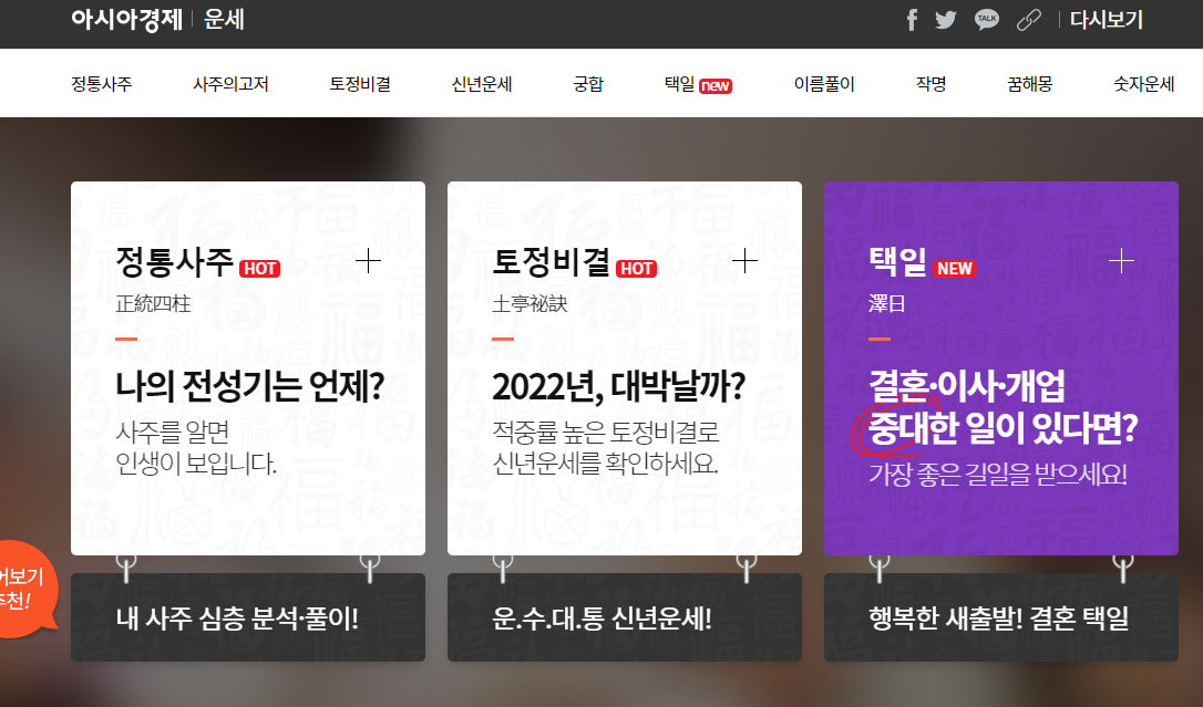 이번엔 아시아경제 신문사에서 제공하는 운세입니다. 흥미로운 점은 사주풀이에 관해 딱딱한 어투가 아닌 설명하듯이 풀이되어 있어서 실제 철학관에 간 것인양 친근감이 들고 재미있습니다. 다만, 일부 풀이만 무료로 제공되고 상세풀이는 유료라는 점은 아쉬운 부분입니다.