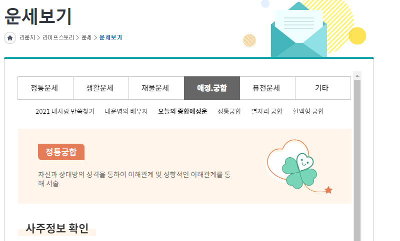 애정/궁합, 오늘의 운세 등 소소한 재미를 느낄 수 있는 읽을거리들이 많습니다.