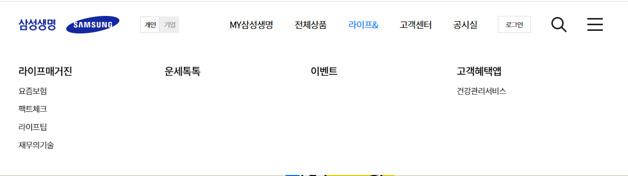 다음은 삼성생명에서 제공하는 무료운세입니다. 상단 메뉴 중 라이프&으로 들어가면 운세톡톡이라는 메뉴가 있습니다.