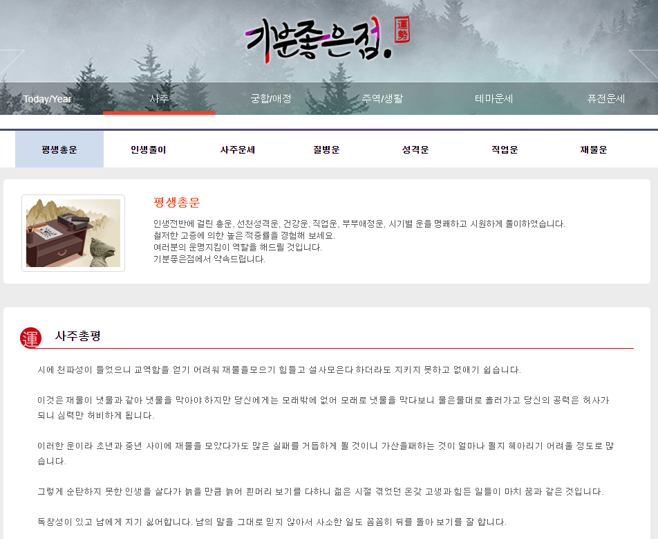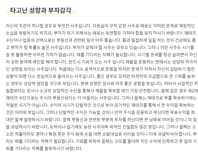 타고난 성향과 부자감각을 이야기해주고, 해당년도의 재물운에 대해 알려줍니다. 믿거나 말거나이긴 하지만 상당히 흥미로운 이야기임에 틀림없죠?