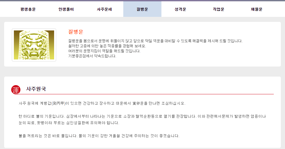 저는 몸이 원체 약한지라 기분좋은날 사이트의 다양한 메뉴중에서도 질병운에 대한 항목을 가장 재밌게 읽었답니다. 실제로 겨울을 가장 힘들어하는 편인데 겨울철 건강에 주의하라는 말이 나왔네요.