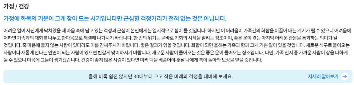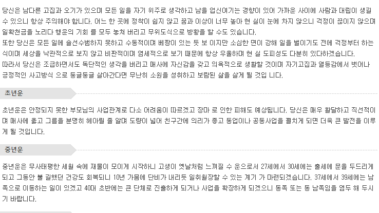 무료운세임에도 불구하고 다양한 항목들을 꼼꼼하게 설명해줍니다. 친절한 사이트라는 느낌을 받았습니다.