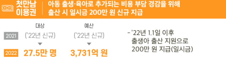 첫만남 이용권이란, 2022년 1월 1일 이후 출생아에게 출생순위와 상관없이 아동 1명당 200만원의 바우처(이용권)를 일시금으로 한 차례 지급하는 것입니다.