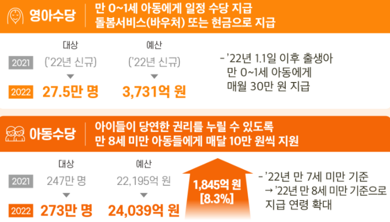 마지막으로 아동수당의 지급연령도 1년 더 늘어납니다. 2022년 부터는 만 8세 미만 아동까지 매월 10만원씩 지급받을 수 있습니다.