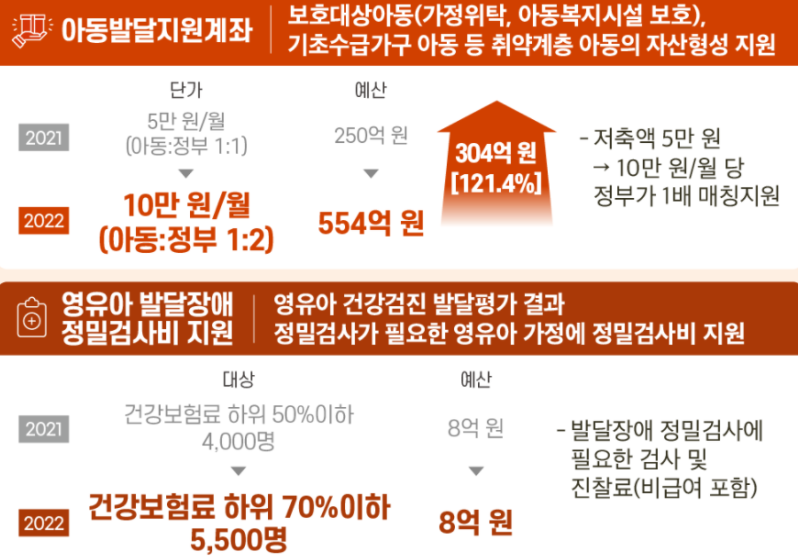 여섯번째, 보호종료아동과 취약계층의 아동들의 자립지원을 사회진출을 위한 지원계좌 사업이 1:1에서 1:2로 지원금이 늘어났습니다.